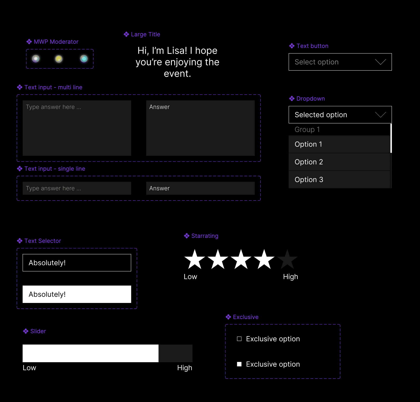 Another layer of dynamic behavior came through visuals. Background colors shifted with sentiment or adapted to brand colors, while subtle animations made the moderator feel more empathetic, reacting to button presses or selections.