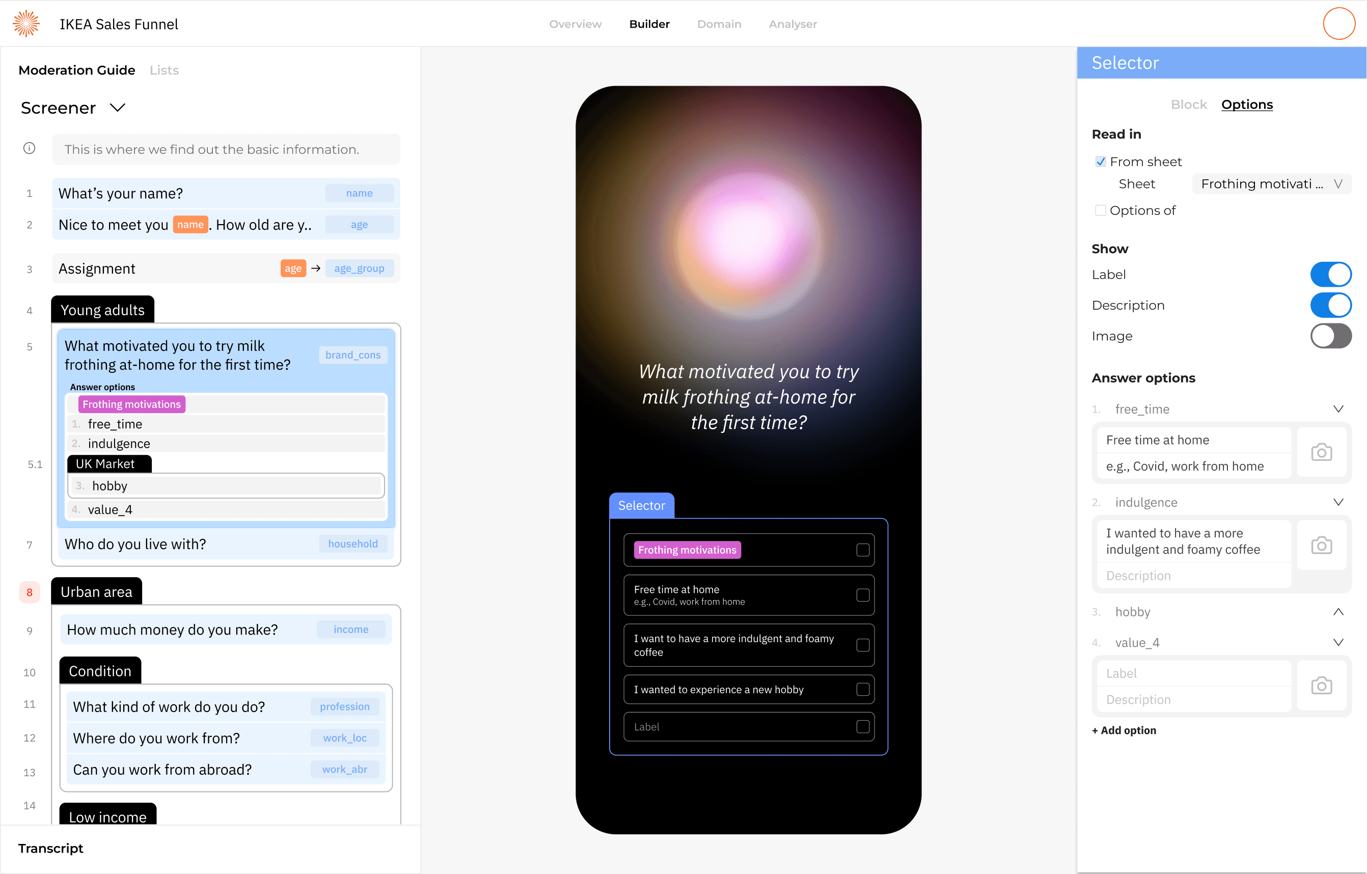Contributed to the end-to-end product design, leading the respondent conversation experience and data visualisation system, while collaborating closely with developers, researchers, and leadership.