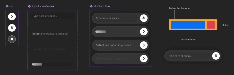 The conversation UI consisting of 3 key modular parts. Moderator & its dialogue, reply block and bottom bar.